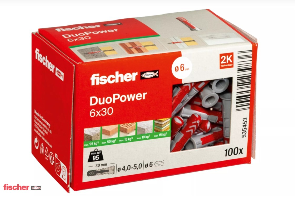 Hmoždinka Fischer DuoPower 6 × 30 mm je inteligentná univerzálna hmoždinka, ktorá sa automaticky prispôsobí stavebnému materiálu, do ktorého je montovaná. Vďaka kombinácii dvoch materiálov (šedý nylon + červený polypropylén) a troch princípov fungovania (rozpínanie, skladanie, uzlovanie) poskytuje najvyššie hodnoty únosnosti v plných, dutých aj doskových stavebných materiáloch. S jedným typom hmoždinky pokryjete väčšinu aplikácií v domácnosti aj na pracovisku — bez nutnosti zisťovať, z čoho je stena postavená.
