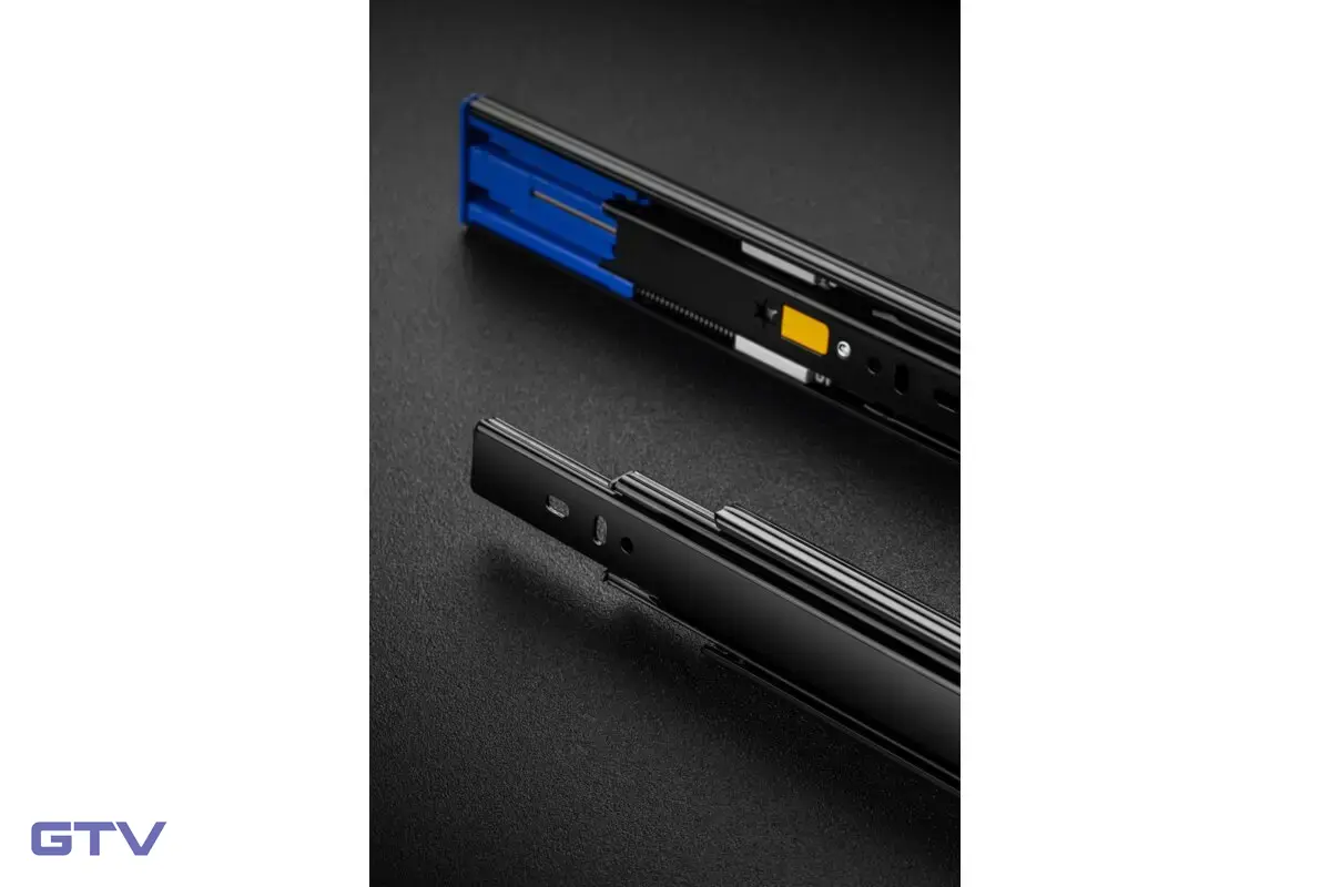 Guličkový plnovýsuv s dĺžkou 500 mm a výškou 45 mm je spoľahlivý kuličkový výsuv s integrovaným dotlmením (soft-close) v čiernom farebnom prevedení, ktorý zabezpečuje tiché a plynulé zatvorenie zásuvky bez bouchnutia. Čierna farba je aktuálne najžiadanejšou alternatívou ku klasickému pozinku — v kombinácii s čiernymi alebo antracitovými zásuvkovými systémami vytvára jednotný, moderný a prémiový vzhľad vnútra skrinky.