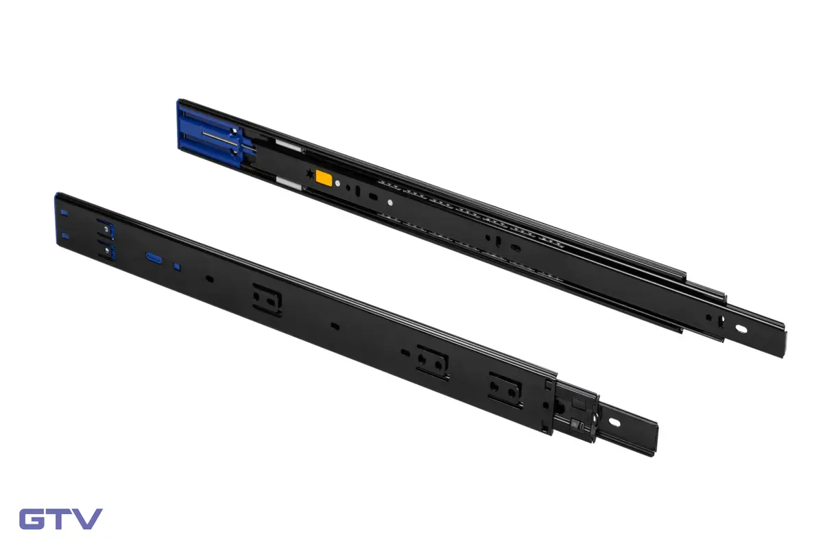 Ideálne použitie: Kuchynské zásuvky v spodných skrinkách s čiernym alebo antracitovým korpusom, moderné kuchyne s tmavým kovaním, šatníkové zásuvky, kancelárske kontajnery, dielenský nábytok, TV stolíky so zásuvkami, komody a všade tam, kde chcete zladiť farbu výsuvov s tmavým interiérom skrinky — čierne prevedenie je dizajnový upgrade oproti klasickému pozinku s rovnakými technickými parametrami, nosnosťou 40 kg a životnosťou 80 000 cyklov.