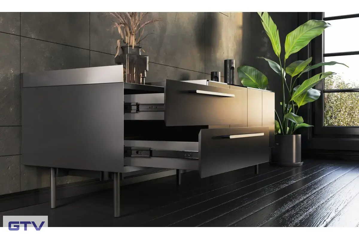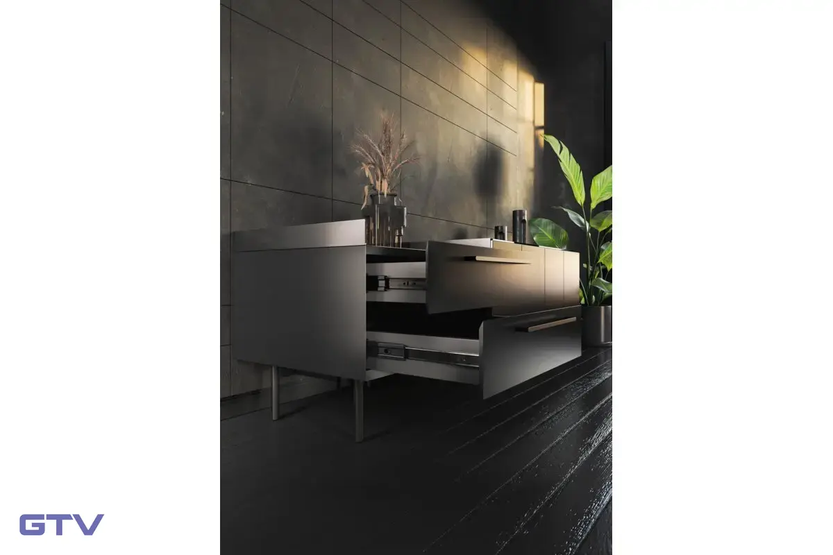 - Neviditeľný v tmavom nábytku — v skrinkách s tmavým korpusom výsuv splýva s prostredím