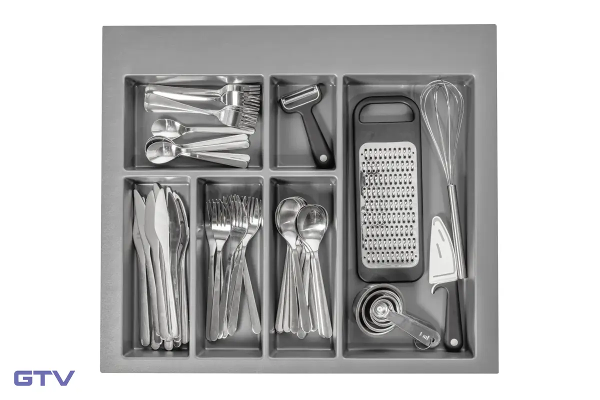 Príborník pre skrinku šírky 600 mm v antracitovej farbe je plastový organizér do kuchynskej zásuvky, ktorý umožňuje prehľadné usporiadanie príborov, kuchynského náčinia a drobností. Exkluzívny dizajn kombinuje vysokokvalitný vzhľad s individuálnou funkčnosťou, prispôsobenou moderným líniám súčasných kuchýň. Šírka 600 mm je najpoužívanejší rozmer v kuchynských linkách — zodpovedá štandardnej šírke kuchynskej spodnej skrinky pod drezom aj vedľa varnej dosky.