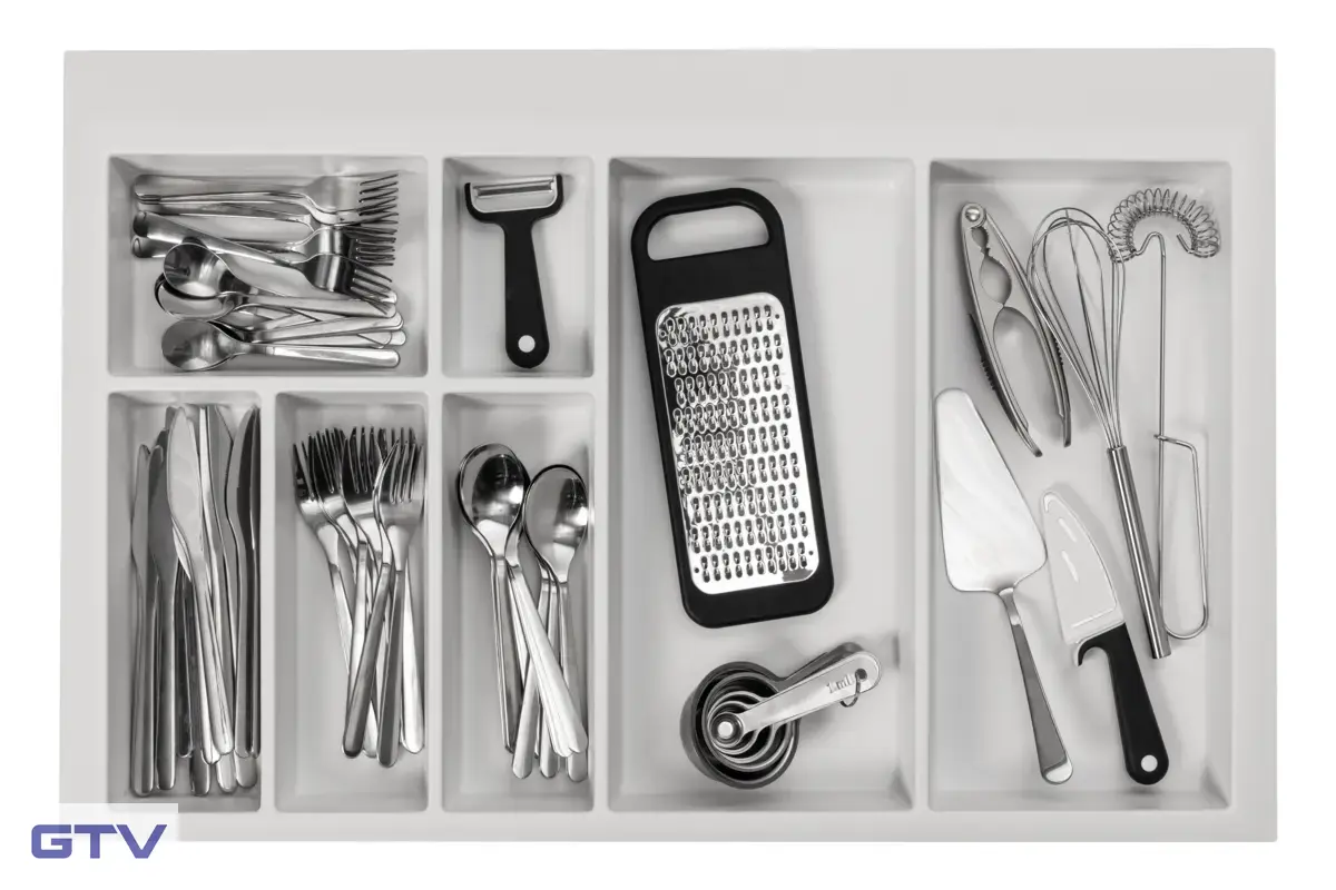 - Väčšie priehradky pre naberačky, stierky, otvárače, šľahače, servírovacie príbory a ďalšie pomôcky