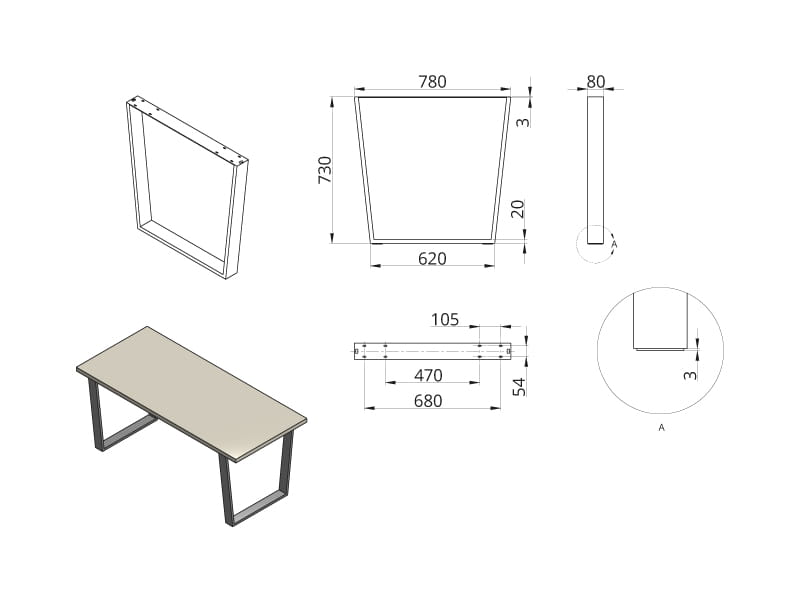 Stolové podnože SA971A 80×20 mm D780×H730 matná biela (2ks v sade)